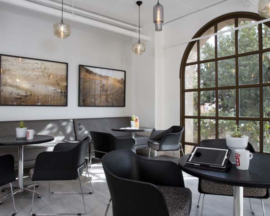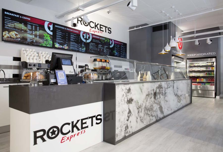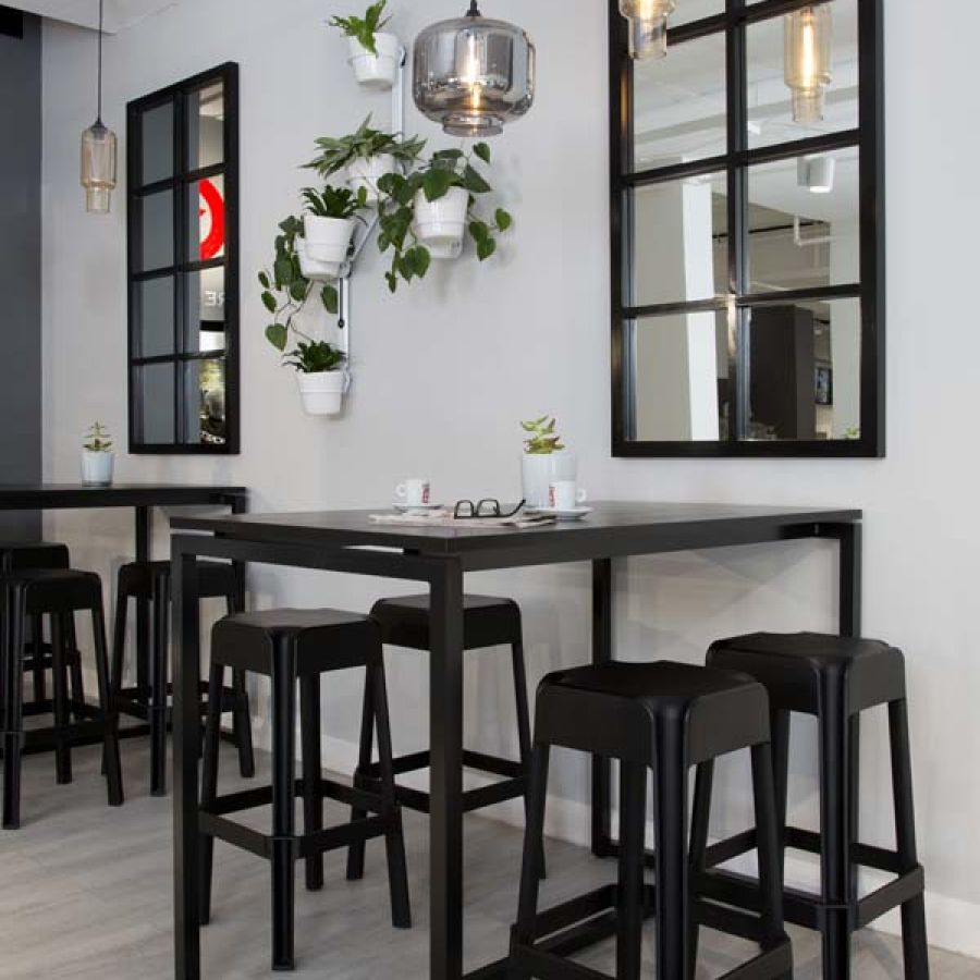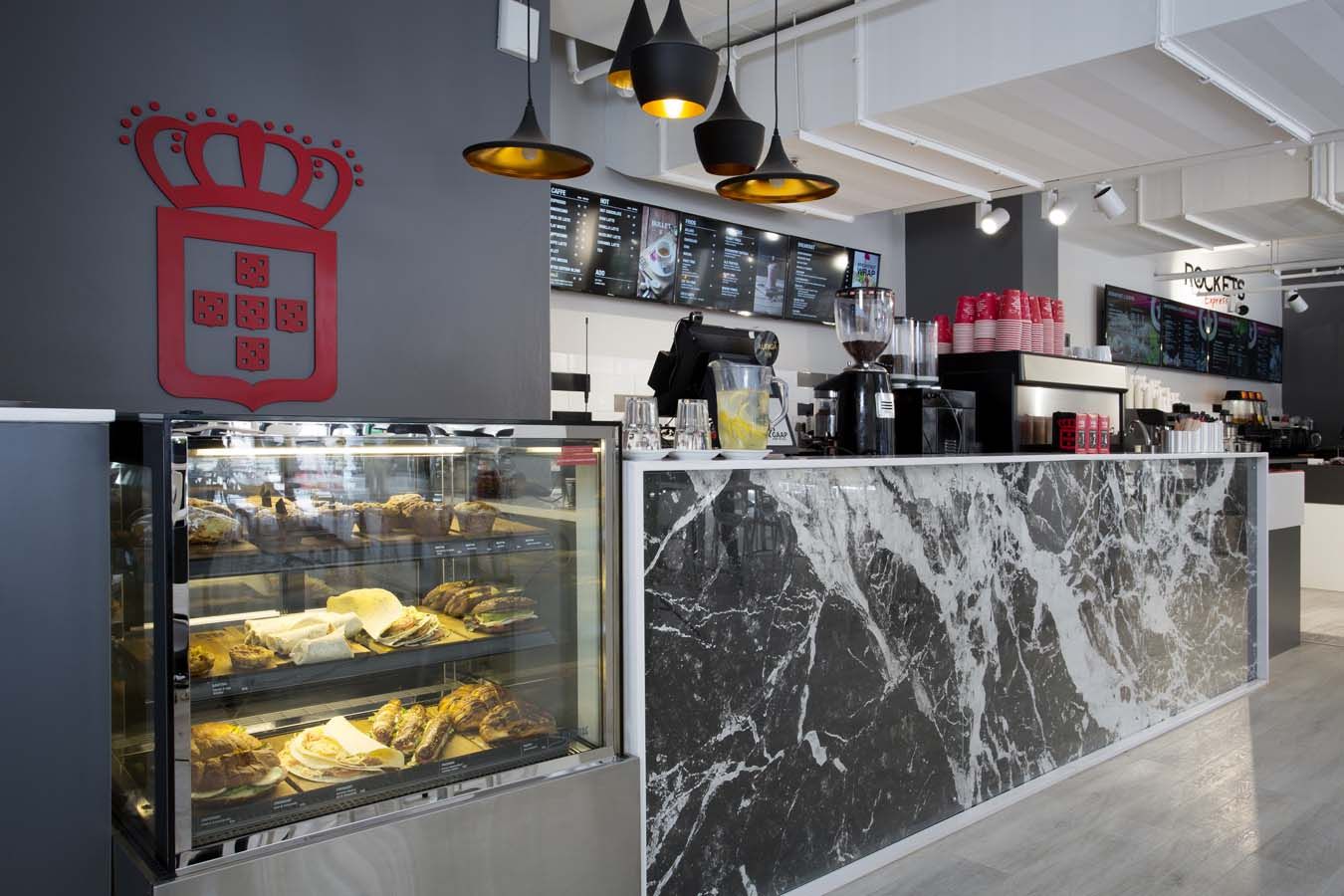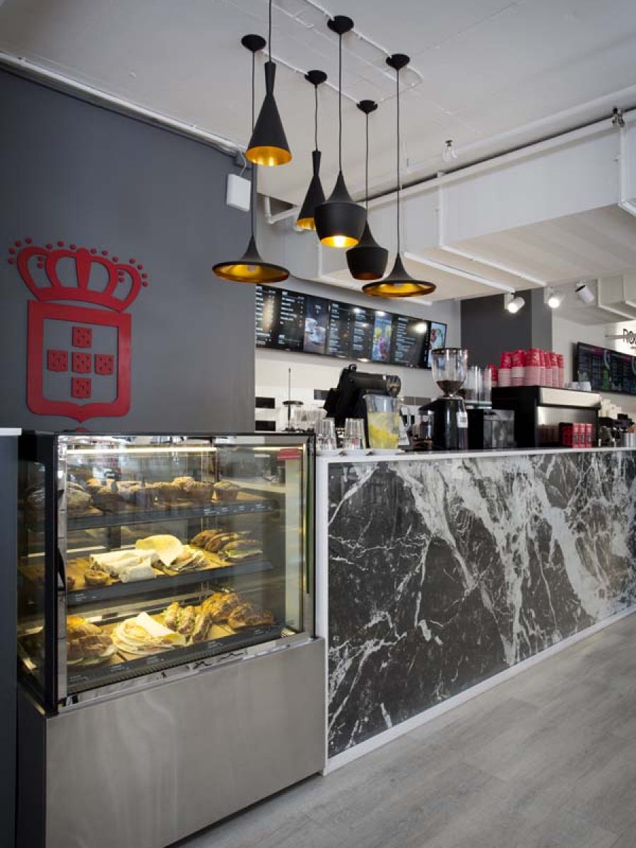 The service counters for the two vendors were conceived of as Yin and Yang designs: where one had white tops – the other had charcoal, where one had grey cabinetry – the other had white. The effect was that the two could stand side-by-side in the elegant, monochromatic environment and maintain their own personality within the overall scheme.